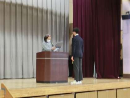 校長先生がスキーの全国大会の生徒引率で不在のため、副校長が話をしました。