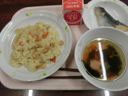 メニューは牛乳、ちらし寿司、すまし汁、鰆のてりやきです。「さわら」は魚に春と書き春を告げる魚です。