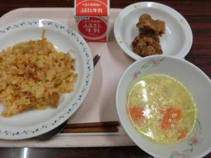 メニューは牛乳、かきたま汁、キムチチャーハン、鳥の空揚げです。