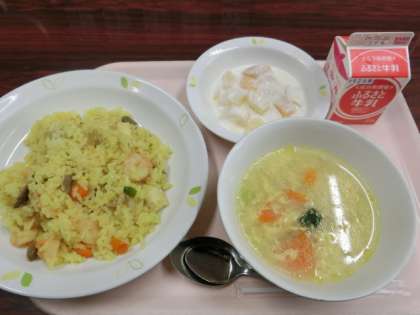 メニューは牛乳、パエリア風海鮮ピラフ、卵と青菜のスープ、フルーツのヨーグルトかけです。ピラフもフルーツも人気メニューです。残さす食べましょう。