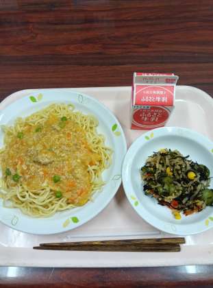 メニューは、牛乳、肉味噌麺、ダイコンとひじきのサラダです。