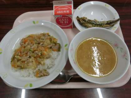 メニューは牛乳、スタミナ丼、シシャモのから揚げ、魚はDHAを多く含み肉食が多い私たちに大切な食品です。残さず食べましょう。