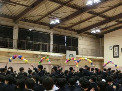 5時間目に体育館で新入生歓迎会が開かれました。写真は入場・各委員会の紹介です。中央委員会の生徒の皆さん準備ありがとうございます。