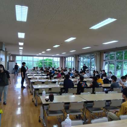 うどん作りが終了し、夕食準備の説明を受けています。みんな声を掛け合い協力して行っています。