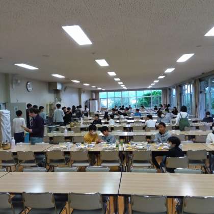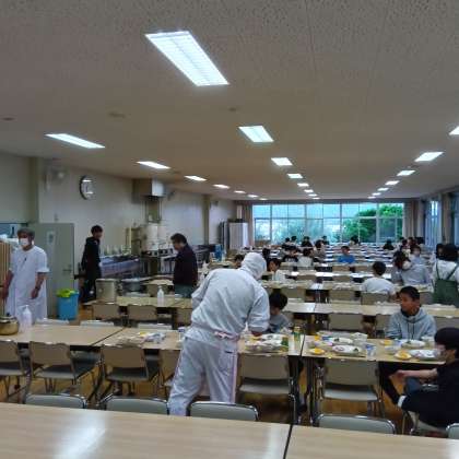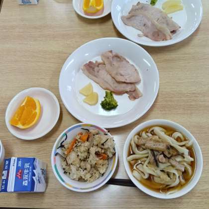 メニューは肉のソテー、五目ごはん、牛乳、オレンジ、そして皆が作ったうどんです。