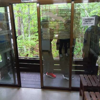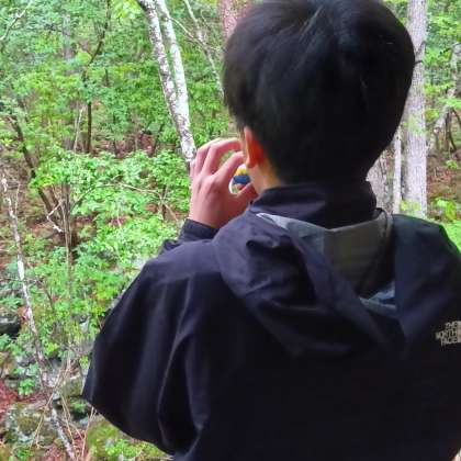 完成した鳥笛で鳥を呼んでいます。