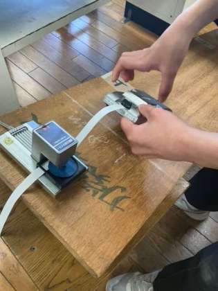 ?3年生は力学の学習をしています。今日は記録タイマーを用いて速さの測定をしました。