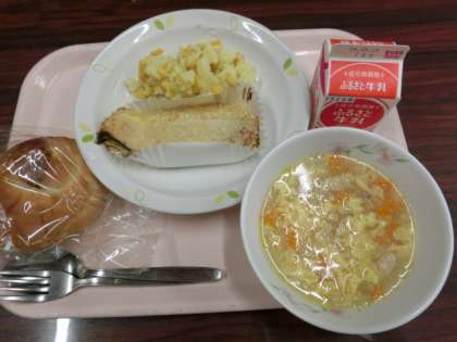 メニューは牛乳、パインパン、魚パン粉焼き、コーンポテト、卵スープです。