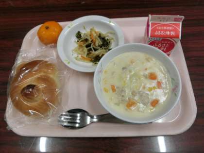メニューは牛乳、ミルクパン、コーンシチュー、野菜の胡麻和え、冷凍ミカンです。