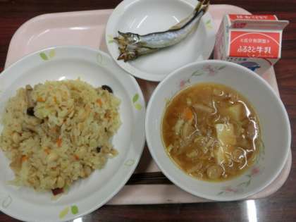 メニューは牛乳、秋の吹き寄せご飯、焼きシシャモ、豚汁です。吹き寄せご飯はサツマイモやキノコなど秋の味覚が満載です。残さず食べましょう。
