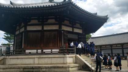 夢殿を見学しています。この後、バスに戻って奈良公園に向かいます。