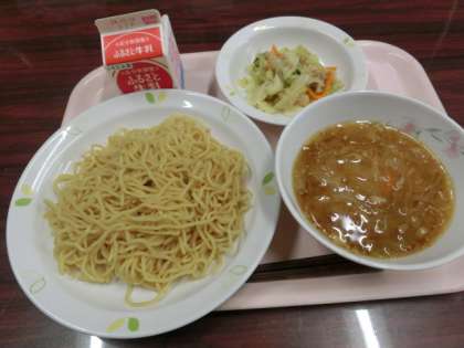 メニューは牛乳、ツナサラダ、みそつけ麺です。キャベツのおいしい季節です。サラダ、つけ麺にたっぷり入っています。残さず食べましょう。