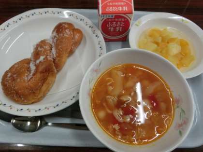 メニューは牛乳、揚げパン、ミネストローネ、フルーツポンチです。