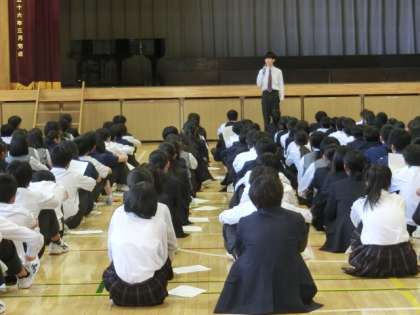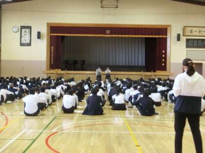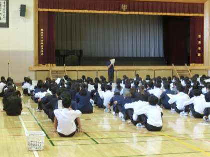 体育館で全校生徒が集まり明日の駒留ルネサンスの注意事項が伝えられ、最後に生徒と教員の実行委員長からお話がありました。