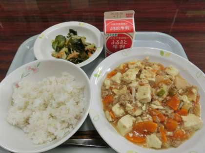 メニューは牛乳、麦入りご飯、西湖豆腐、わかめサラダです。西湖豆腐は具がたくさん入っていて栄養満点です。残さず食べましょう。