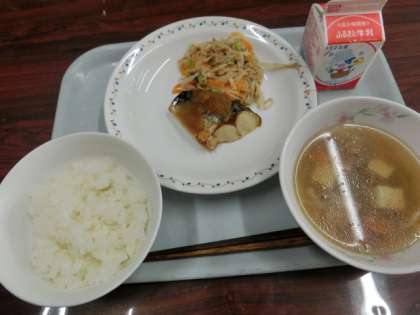 メニューは牛乳、ごはん(有機米)、鯖のおろしソースがけ、おひたし、けんちん汁です。