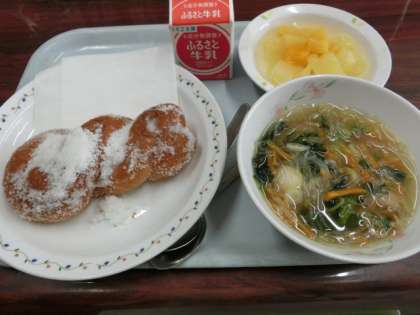 メニューは牛乳、揚げパン(砂糖)、春雨スープ、フルーツポンチです。春雨スープは寒い日にぴったりです。残さず食べましょう。
