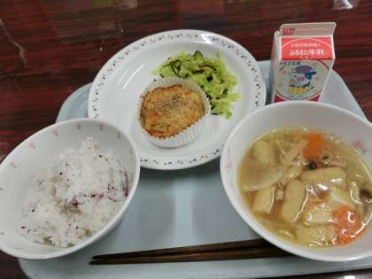 メニューは牛乳、ゆかりご飯、松風焼き、野菜の昆布和え、吉野汁です。本日の松風焼きのお肉は豚肉でした。吉野汁のやさしい風味がおいしい季節です。