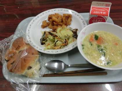 メニューは牛乳、イカのかりん揚げ、ビーフン、中華風スープ、ブドウパンです。ビーフンには野菜がたくさん入っています。体調を整えるためにも残さず食べましょう。