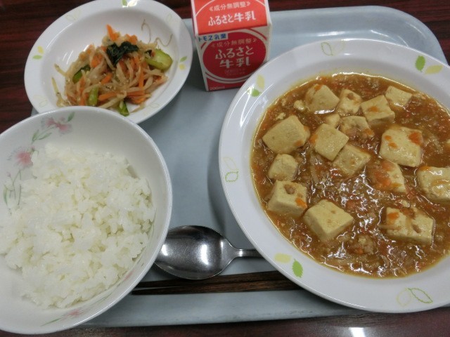 メニューは牛乳、有機米ご飯、カレーマーボー豆腐、ナルムです。お米の値段が高騰しています。感謝して残さず食べましょう。