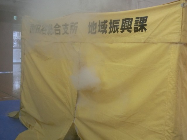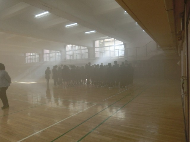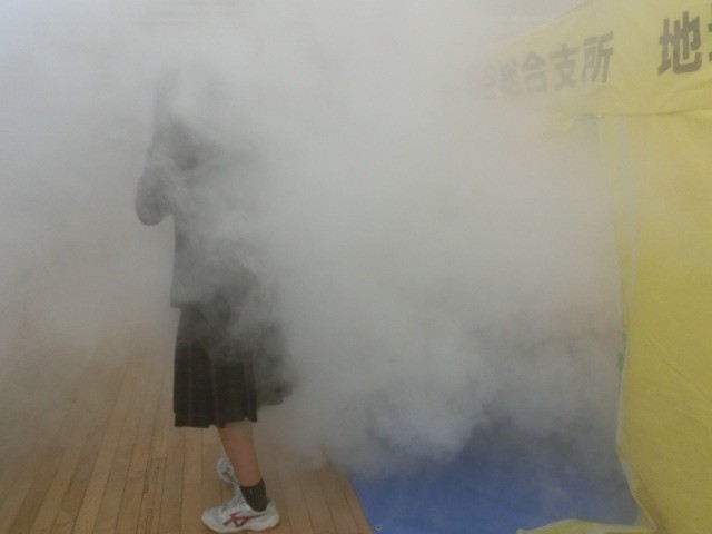 地域振興課の方にお越しいただき、全校学年ごとに煙中訓練を行いました。皆真剣に行っていました。ちなみに、煙はチョコレートのフレーバーでした。