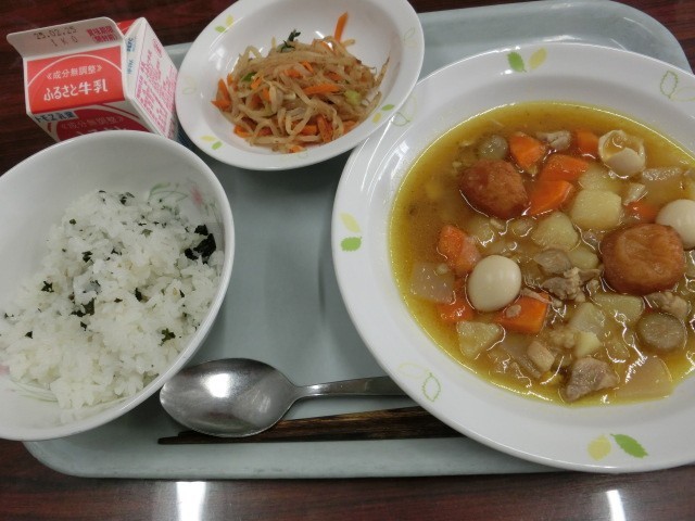 メニューは牛乳、わかめご飯、鶏肉とジャガイモのうま煮、野菜のおかか和えです。わかめご飯は人気メニューの一つです。残さず食べましょう。