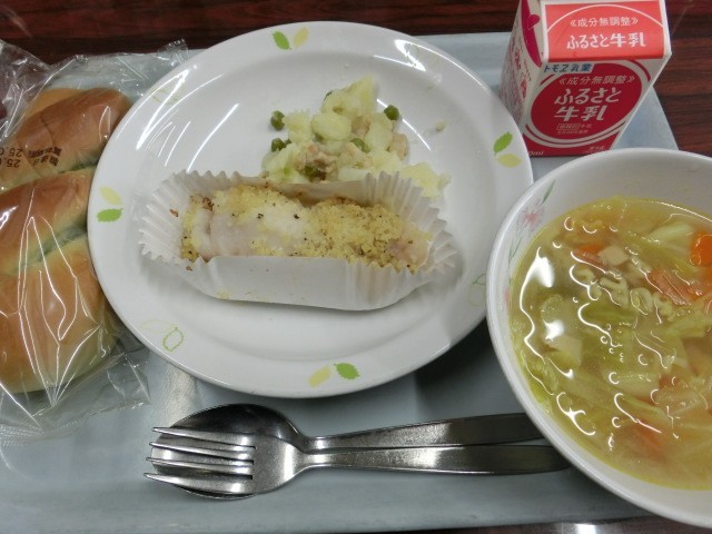 メニューは牛乳、あしたばパン、ABCマカロニスープ、メルルーサのチーズハーブパン焼き、ジャーマンポテトです。何度も書きますが、メルルーサはフードマイレージが大きい食品です。また食品の値段が高騰していることもあります。感謝して残さず食べましょう。