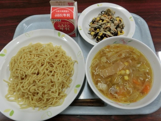 メニューは牛乳、満点サラダ、みそつけ麺です。満点サラダは日頃不足する、鉄分等を多く含むヒジキが入っています。残さず食べましょう。