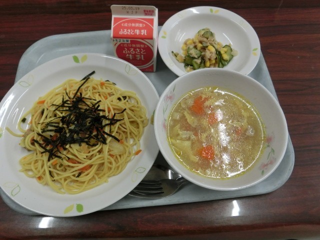 メニューは牛乳、和風スパゲティ、卵スープ、ビーンズサラダです。豆類は食物繊維やたんぱく質が豊富に含まれています。残さず食べましょう。