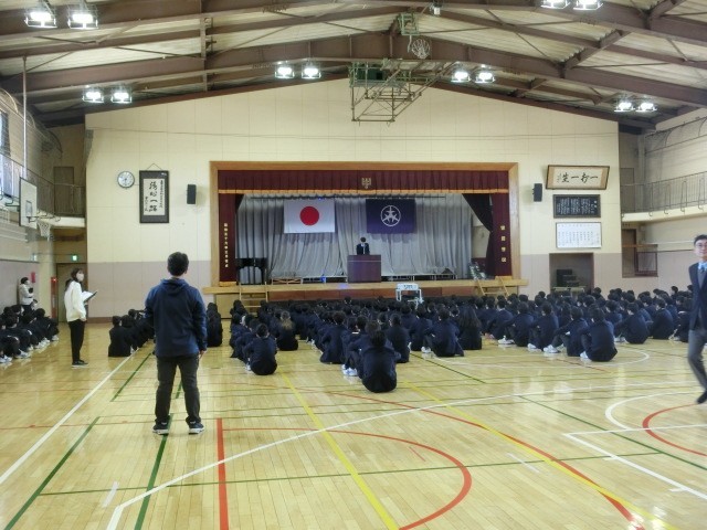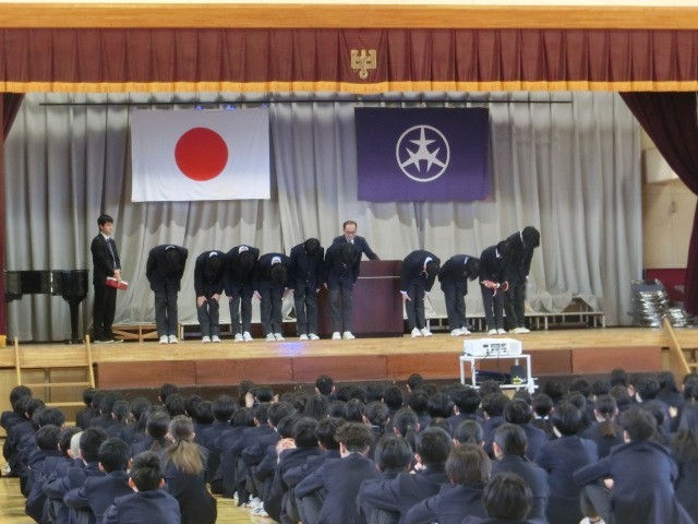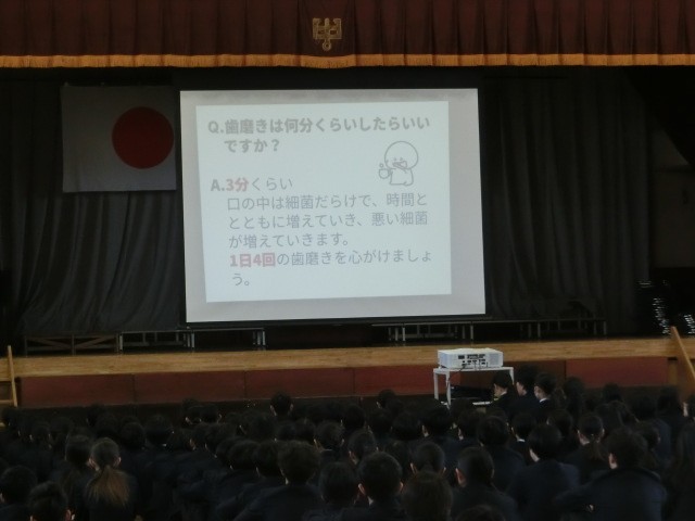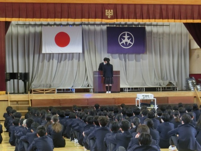 生徒朝会では、生徒会長の話、図書委員会の表彰、男子バスケット部の表彰、保健衛生委員会の発表がありました。