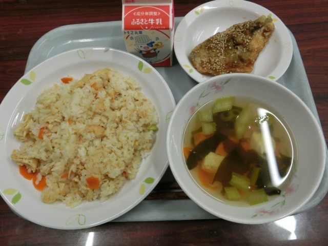 メニューは牛乳、鮭のちらし寿司、お澄まし、ホッケのから揚げです。お澄ましには桜の花のかまぼこが入り、入学、進級のお祝いです。