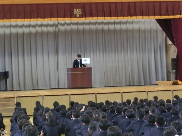 生徒朝会では認証式と生徒会長のあいさつを行いました。生徒会長からは「挨拶」の大切さのお話がありました。