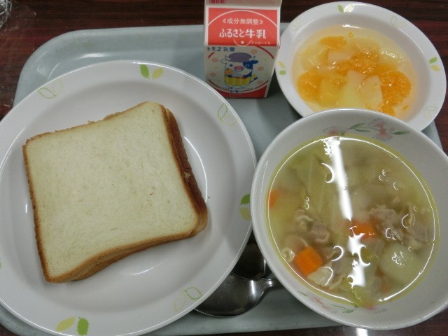 メニューは牛乳、フルーツポンチ、キャベツスープ、ツナコーントーストです。ツナコーントーストは生徒の人気の味付けです。残さず食べましょう。
