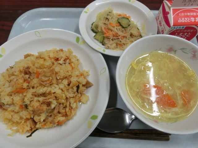 メニューは牛乳、コーンスープ、春雨サラダ、キムチチャーハンです。キムチチャーハンは人気メニューの一つです。残さず食べましょう。