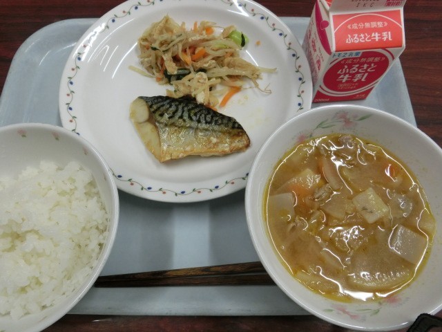 メニューは牛乳、ごはん、サバのみぞれ煮、おひたし、豚汁です。サバは体に良い油脂がたっぷり含まれています。残さず食べましょう。