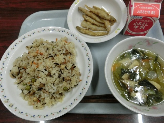 メニューは牛乳、大豆入りひじきご飯、ワカサギのから揚げ、豆腐汁です。2日続けての魚メニューとなりました。特にワカサギは丸ごと食べるため、カルシウムも摂取することができます。残さず食べましょう。