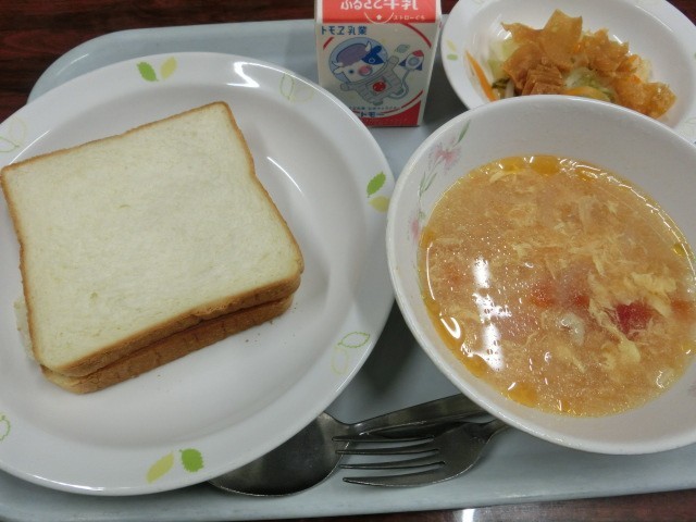 メニューは牛乳、ツナコーントーストサンド、卵とトマトのスープ、パリパリサラダです。急に暑くなりました。体調管理の難しい季節です。睡眠・休養・栄養を充分に取り体調を整えましょう。