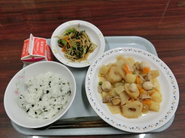 メニューは牛乳、わかめご飯、豚肉と大根のうま煮、もやしと小松菜の胡麻あえです。野菜は体調を整えるのに大切な食品です。残さず食べましょう。