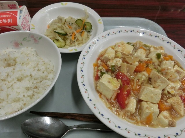メニューは牛乳、西湖豆腐、ごまご飯、大根とじゃこのカリカリサラダです。西湖豆腐はシーホーどうふと言います。トマトやタケノコ、ピーマン等野菜がたっぷりな料理です。残さず食べましょう。