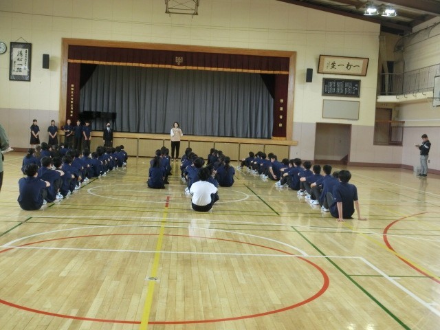 26日月曜日は2年生が体育館で学年朝会を行いました。各クラスの委員のお話、学年主任の先生のお話がありました。