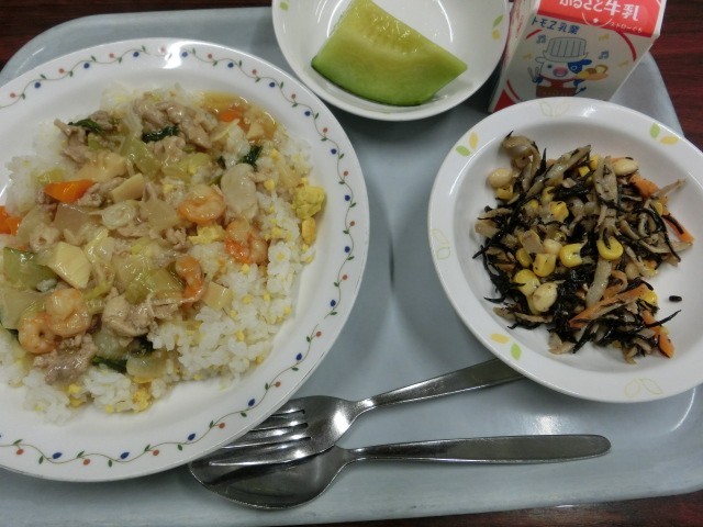 メニューは牛乳、あんかけチャーハン、満点サラダ、メロンです。あんかけチャーハンは野菜が豊富で栄養満点です。残さず食べましょう。