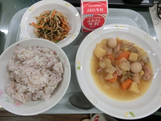 メニューは牛乳、ゆかりご飯、鶏肉とジャガイモのうま煮、野菜の海苔和えです。煮物にはウズラの卵入りです。残さず食べましょう。