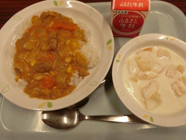 メニューは牛乳、夏野菜カレー、フルーツのヨーグルトかけです。夏野菜はいろいろありますが、今日のカレーにはカボチャ、トウモロコシが入っています。家で作る場合は、ナスやピーマン、モロヘイヤを入れてもおいしいですね。