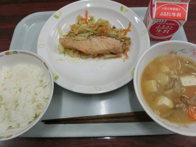メニューは牛乳、ごはん、鮭のマヨネーズみそ焼き、キャベツのおかか和え、いなか汁です。本日のカロリーは766キロカロリーです。魚料理はマヨネーズ等で生徒の食欲が進むように栄養士さんが工夫してくださっています。残さず食べましょう。