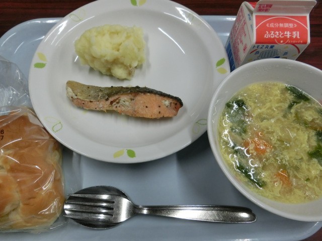 メニューは牛乳、パインパン、鮭のハーブ焼き、クリームポテト、卵と青菜のスープです。パインパンは生徒に大人気のパンです。残さず食べましょう。