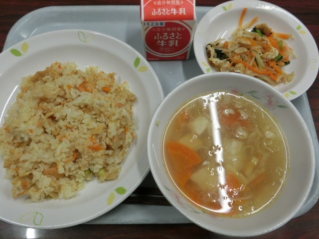 メニューは牛乳、ちらしずし、おひたし、七夕汁です。七夕汁には、素麵と星型の黄色いかまぼこ入りです。残さず食べましょう。