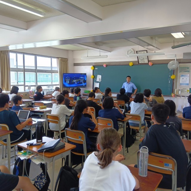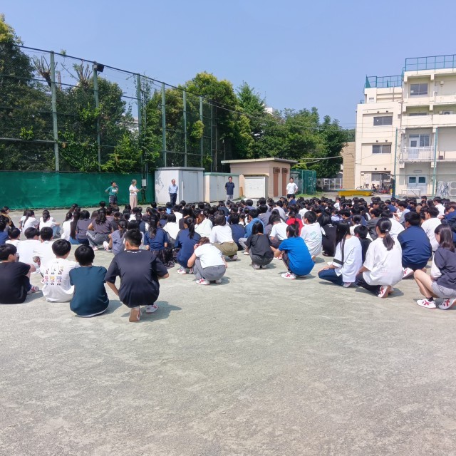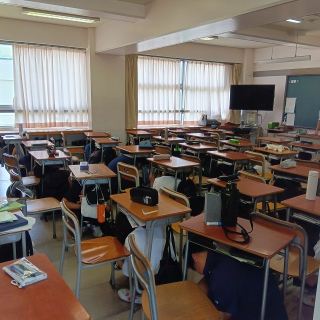 緊急地震速報の合図で机下避難、放送と担任の先生の指示の元グランドに避難しました。避難訓練の後は、教室に戻り危険回避の行動を学びました。