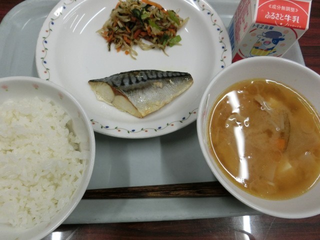 メニューは牛乳、ごはん、さばの塩焼き、野菜の海苔和え、豚汁です。サバはDHAが豊富な食品です。残さず食べましょう。