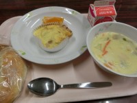 メニューは牛乳、ソフトフランスパン、チーズ入りオムレツ、クリームシチュー、デコポ...
