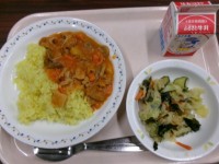 メニューは牛乳、わかめサラダ、ハッシュドライスです。3年生は最後の給食で、義務教...